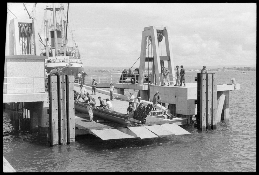 Date26 October 1974Reference Numberphoto gcc-26444DescriptionThe Te Awanui waka, christened the Bay of Plenty Harbour Board's new roll-on-roll-off link span yesterday when it was hauled on to dry land after a trip across the harbour under tow. The canoe is being featured at the Tauranga Rock and Mineral Club's annual exhibition in the Mount Maunganui sports stadium. It will be placed alongside a piece of moon-rock lent to the club by the National Museum. Docking at the link span proved a little tricky in the fresh breeze and tidal rip but with the concerted effort of many hands the canoe was finally dragged out of the water. Published 25 October 1974.FormatNegativePhysical Description35mm black-and-white negative (4/6)Photographer/CreatorBay of Plenty Times