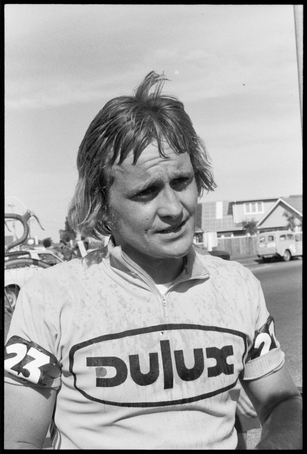 Date5 November 1974Reference Numberphoto gcc-26496DescriptionMike Hughes of Southland, winner of second stage of Dulux six-day road cycling tour into Tauranga. FormatNegativePhysical Description35mm black-and-white negative (3/12)Photographer/CreatorBay of Plenty Times