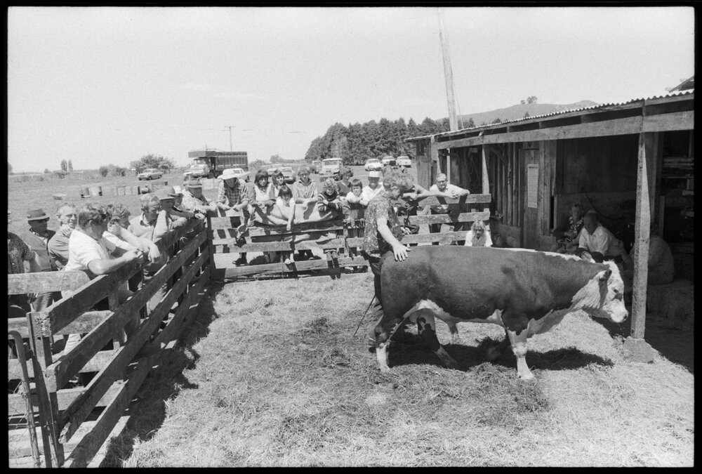 Date5 November 1974Reference Numberphoto gcc-26512DescriptionProspective buyers and onlookers ponder the value of some of the cattle offered yesterday while auctioneer Mr Val Ditchfield (left foreground) encourages them to make their bids. Published 5 November 1974.FormatNegativePhysical Description35mm black-and-white negative (4/6)Photographer/CreatorBay of Plenty Times