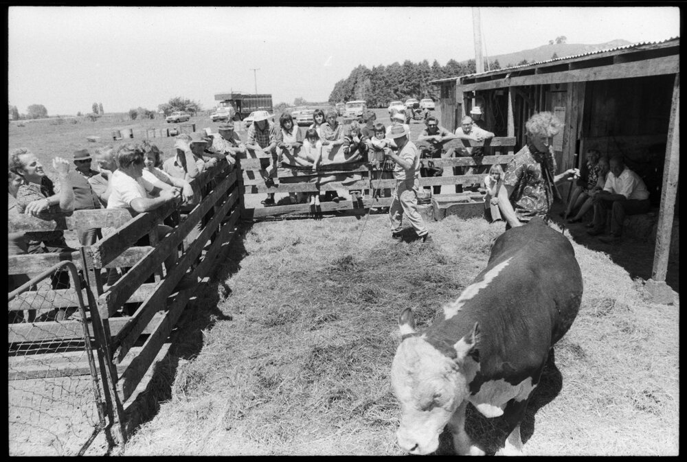 Date5 November 1974Reference Numberphoto gcc-26513DescriptionProspective buyers and onlookers ponder the value of some of the cattle offered yesterday while auctioneer Mr Val Ditchfield (left foreground) encourages them to make their bids. Published 5 November 1974.FormatNegativePhysical Description35mm black-and-white negative (5/6)Photographer/CreatorBay of Plenty Times