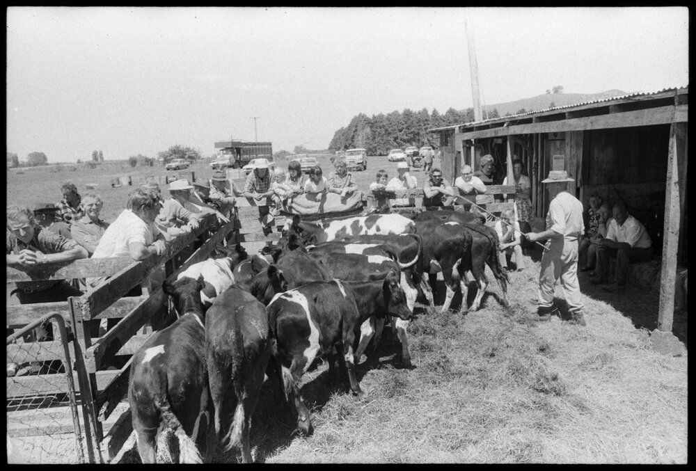Date5 November 1974Reference Numberphoto gcc-26514DescriptionProspective buyers and onlookers ponder the value of some of the cattle offered yesterday while auctioneer Mr Val Ditchfield (left foreground) encourages them to make their bids. Published 5 November 1974.FormatNegativePhysical Description35mm black-and-white negative (6/6)Photographer/CreatorBay of Plenty Times
