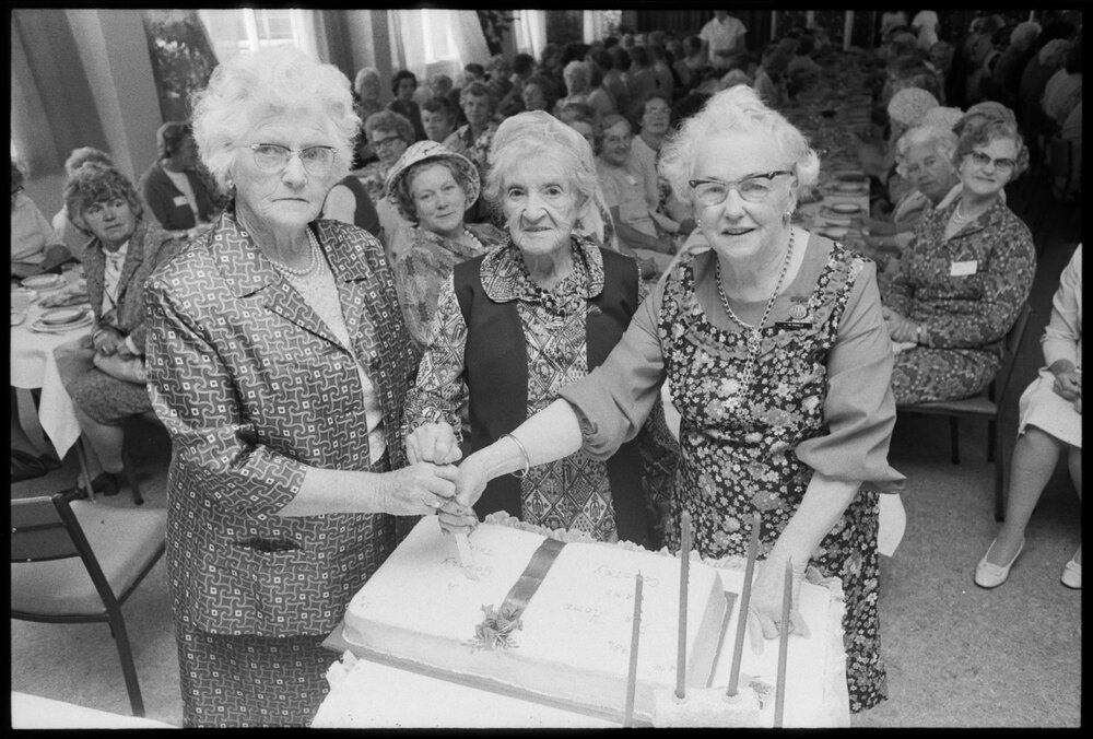 Date7 November 1974Reference Numberphoto gcc-26577DescriptionThe 40th Anniversary of the Tauranga Federation of the Country Women's Institute saw over 200 members attending a luncheon this week. Members from all over the Bay of Plenty were present and the cutting of the cake marked the start of the special occasion. Pictured left to right Mesdames A. Stenhouse, M. Christian and L. McDonald. Published 7 November 1974.FormatNegativePhysical Description35mm black-and-white negative (1/3)Photographer/CreatorBay of Plenty Times