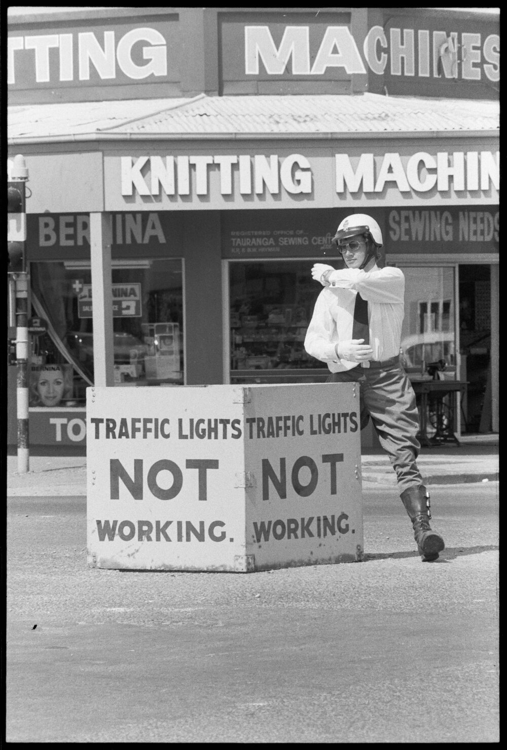 Date7 November 1974Reference Numberphoto gcc-26586DescriptionThe traffic lights at 11th Avenue and Cameron Road were taken down by the Tauranga City Council works department for maintenance. Traffic officers took turns throughout the day to keep traffic flowing smoothly, as Traffic Officer C. R. Hodgson is doing in the photograph. The lights were repaired in time for the 5 o'clock rush. Published 7 November 1974.FormatNegativePhysical Description35mm black-and-white negative (1/6)Photographer/CreatorBay of Plenty Times