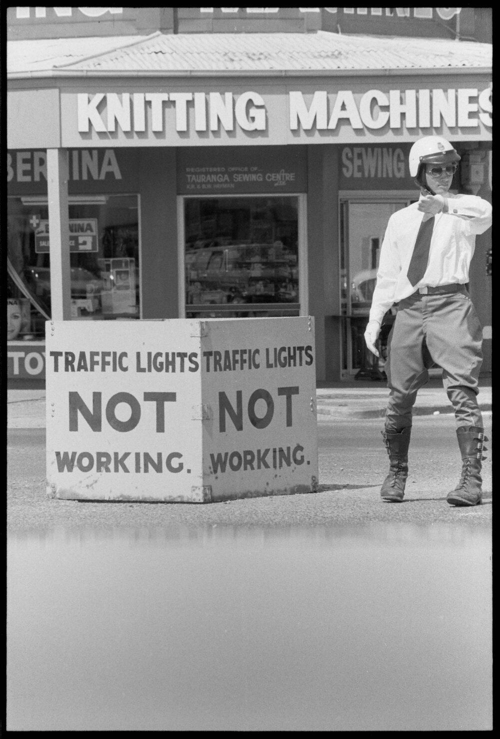Date7 November 1974Reference Numberphoto gcc-26587DescriptionThe traffic lights at 11th Avenue and Cameron Road were taken down by the Tauranga City Council works department for maintenance. Traffic officers took turns throughout the day to keep traffic flowing smoothly, as Traffic Officer C. R. Hodgson is doing in the photograph. The lights were repaired in time for the 5 o'clock rush. Published 7 November 1974.FormatNegativePhysical Description35mm black-and-white negative (2/6)Photographer/CreatorBay of Plenty Times