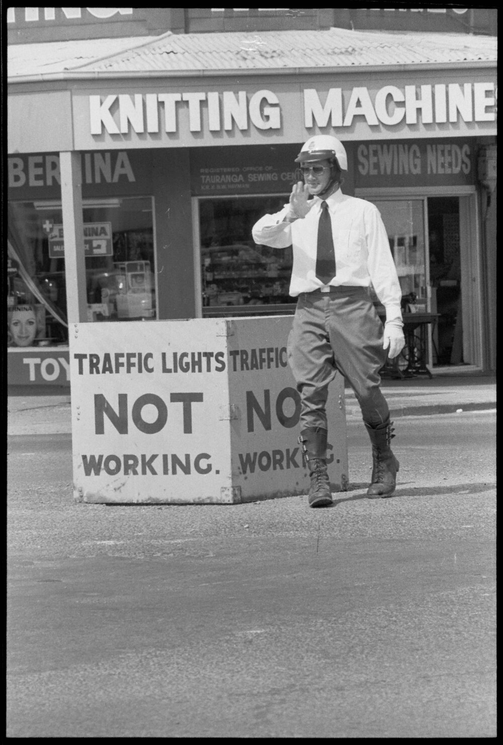 Date7 November 1974Reference Numberphoto gcc-26591DescriptionThe traffic lights at 11th Avenue and Cameron Road were taken down by the Tauranga City Council works department for maintenance. Traffic officers took turns throughout the day to keep traffic flowing smoothly, as Traffic Officer C. R. Hodgson is doing in the photograph. The lights were repaired in time for the 5 o'clock rush. Published 7 November 1974.FormatNegativePhysical Description35mm black-and-white negative (6/6)Photographer/CreatorBay of Plenty Times