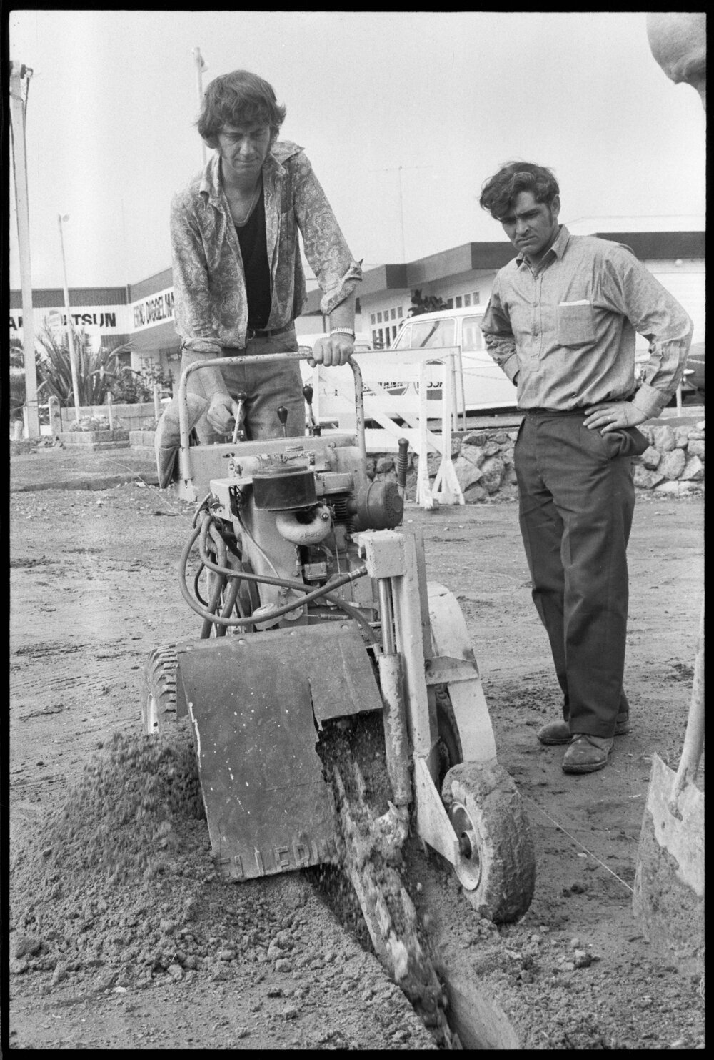 Date8 November 1974Reference Numberphoto gcc-26617DescriptionPreliminary work for the installation of Tauranga's second set of traffic lights at the intersection of Elizabeth Street and Cameron Road is now under way. It includes the laying of the electric cables and men seen here preparing trenches for the wiring are, from left, Messrs L. Grimes and E. Ormsby, from the Tauranga City Council's Electricity Department. The lights are expected to come into service early in the New Year. Published 8 November 1974.FormatNegativePhysical Description35mm black-and-white negative (4/6)Photographer/CreatorBay of Plenty Times
