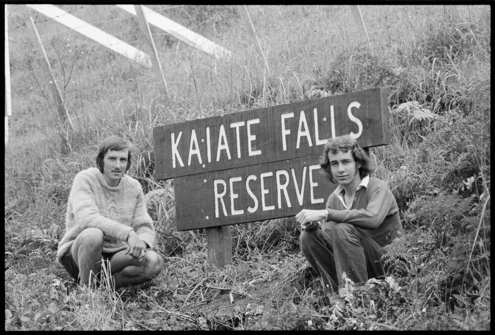 Date9 November 1974Reference Numberphoto gcc-26645DescriptionThis entrance sign to Kaiate Falls at Welcome Bay, was carved by Mr Peter Weeks, left, a past Venturer, and Mr Gary Faulkner, Southern Cross Venturer Unit leader, as part of a long-term project by the unit to develop and beautify the area. Published 9 November 1974.FormatNegativePhysical Description35mm black-and-white negative (2/3)Photographer/CreatorBay of Plenty Times