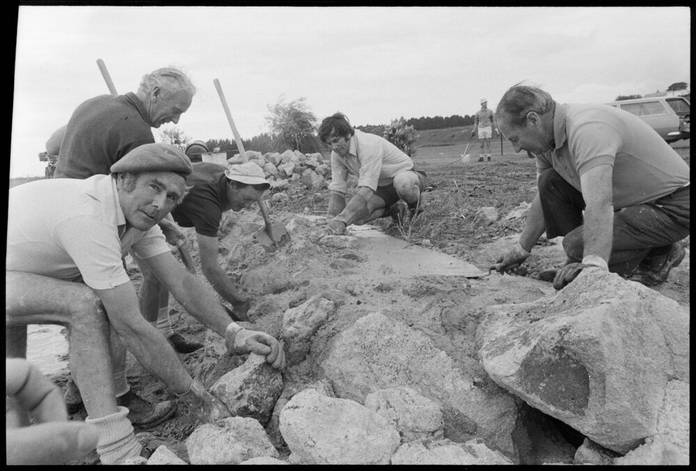 Date11 November 1974Reference Numberphoto gcc-26664DescriptionWorking on a community service project are these members of the Ōtūmoetai Rotary Club. The men are building a wall to contain the sea in an effort to keep Fergusson Park dry. From left to right are Messrs T. Murray, T. Flawn, P. O'Brien, W. Moulton, and I. Boagey. Published 11 November 1974.FormatNegativePhysical Description35mm black-and-white negative (6/8)Photographer/CreatorBay of Plenty Times