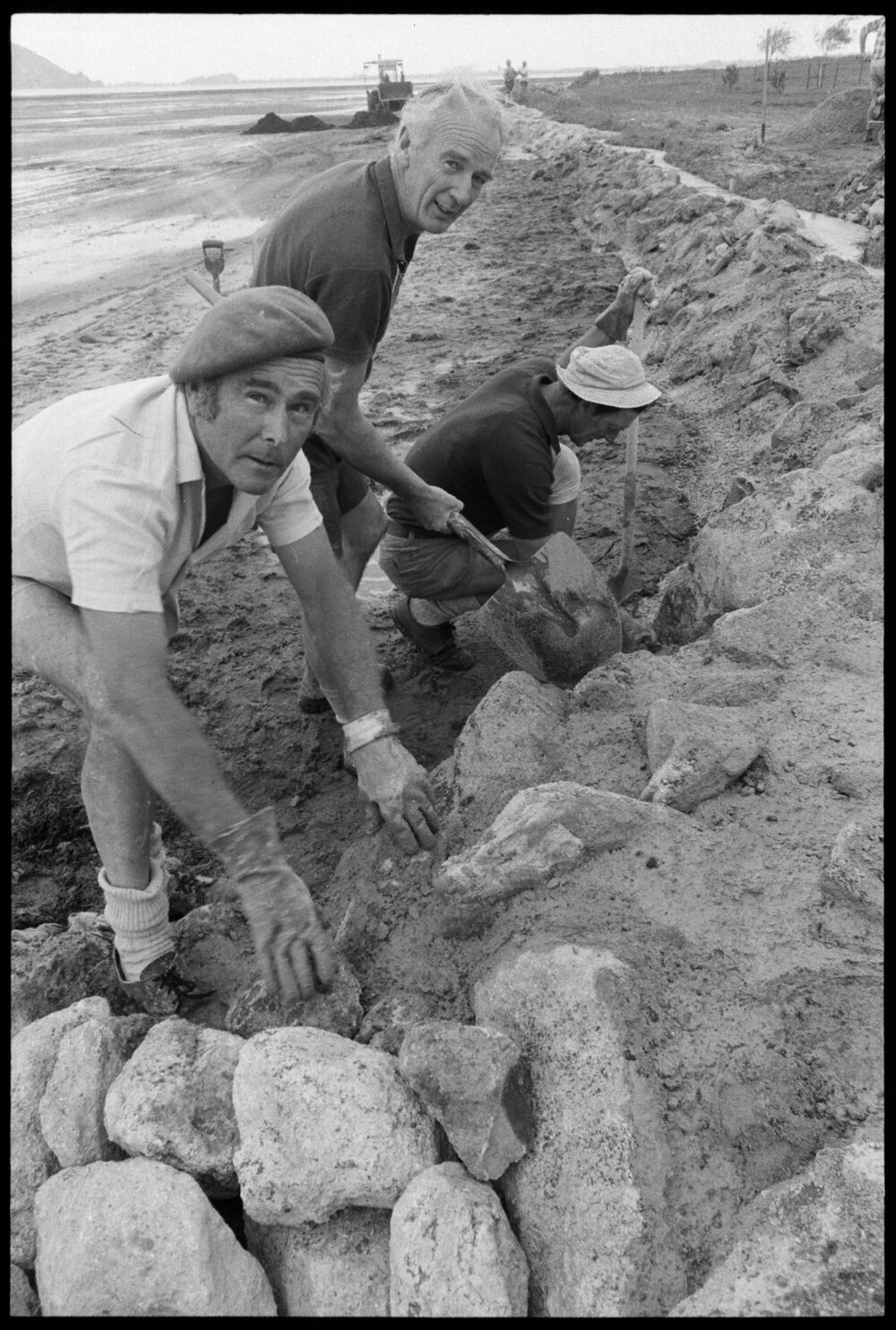 Date11 November 1974Reference Numberphoto gcc-26666DescriptionWorking on a community service project are these members of the Ōtūmoetai Rotary Club. The men are building a wall to contain the sea in an effort to keep Fergusson Park dry. From left to right are Messrs T. Murray, T. Flawn, P. O'Brien, W. Moulton, and I. Boagey. Published 11 November 1974.FormatNegativePhysical Description35mm black-and-white negative (8/8)Photographer/CreatorBay of Plenty Times