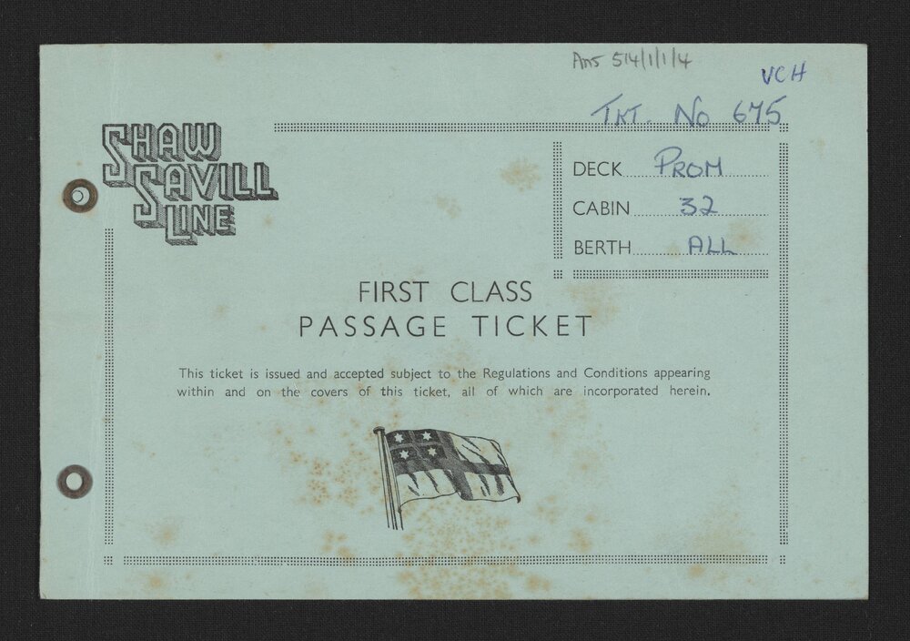 Rogers, Frank Clifford, 1907-1989, Shaw Savill Line First Class Passage Ticket, 8 Oct 1959 (8 October 1959). Pae Korokī, accessed 08/04/2026, https://paekoroki.tauranga.govt.nz/nodes/view/112697