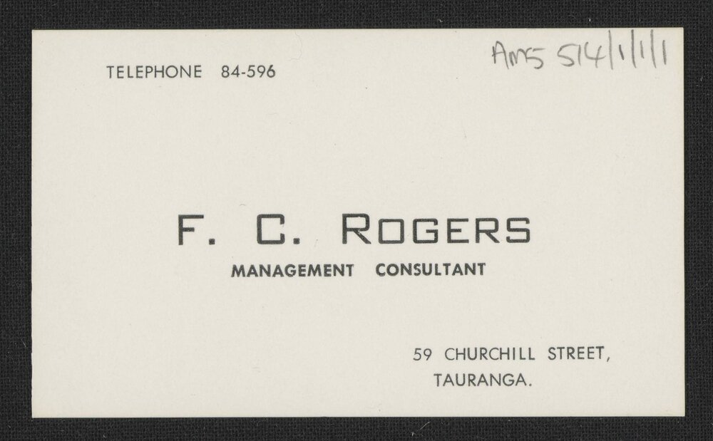 Rogers, Frank Clifford, 1907-1989, F. C. Rogers business card (c. 1940-c. 1970). Pae Korokī, accessed 08/04/2026, https://paekoroki.tauranga.govt.nz/nodes/view/112702