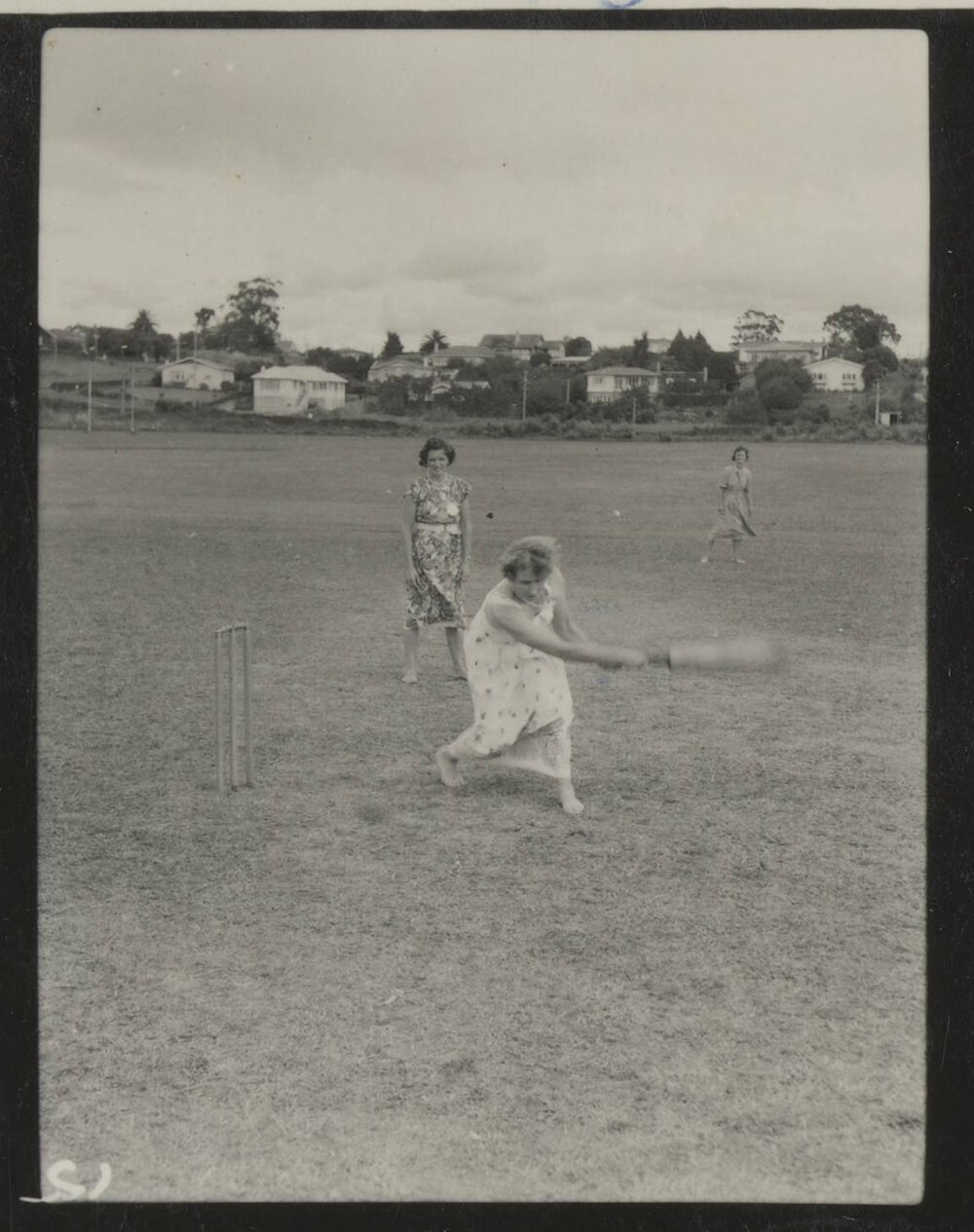 Datec. 1950-1975Reference NumberPhoto 25-010DescriptionBlurry image of four people on the field at a Ladies Sports Shield trophy cricket match, Memorial Park.