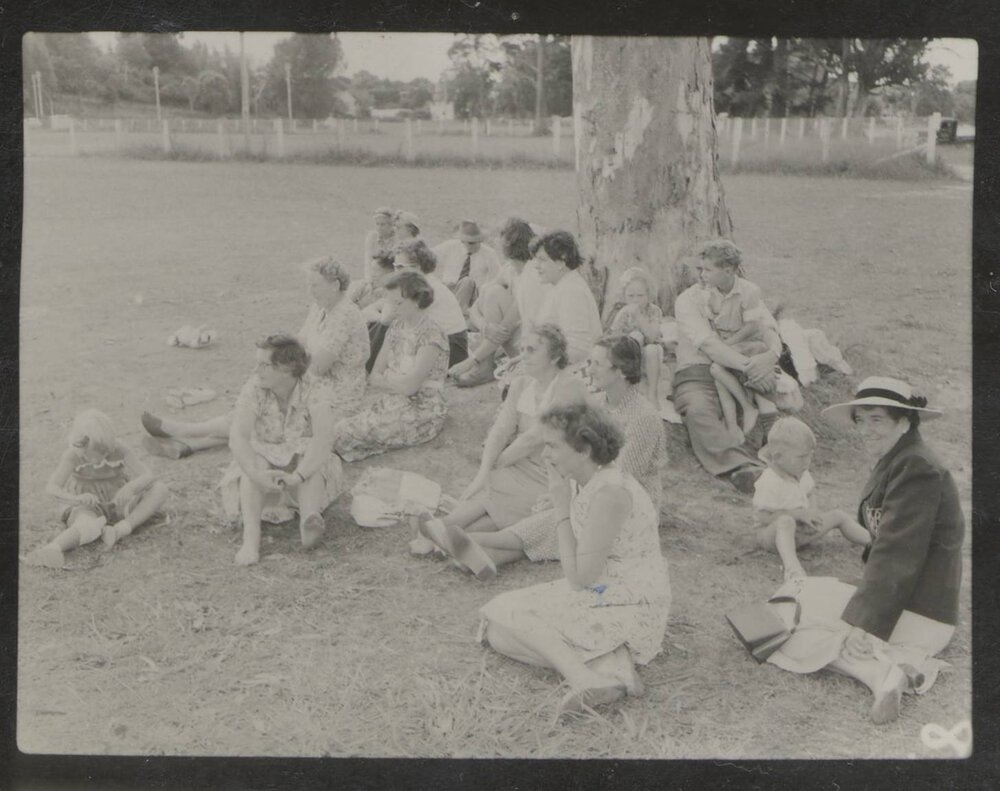 Datec. 1950-1975Reference NumberPhoto 25-008DescriptionSpectators and possibly batting team, sitting on the grass under a tree.