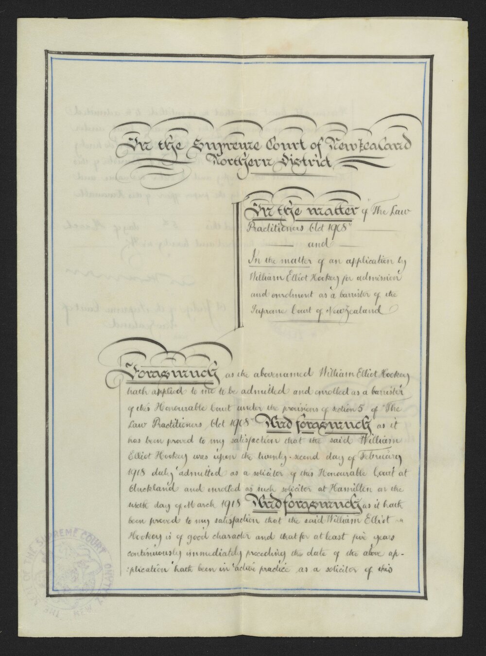 Hodge, Keys and Hookey (Solicitors), Barrister enrolment of William Elliot Hookey, 5 Mar 1926 (5 March 1926). Pae Korokī, accessed 08/04/2026, https://paekoroki.tauranga.govt.nz/nodes/view/112814