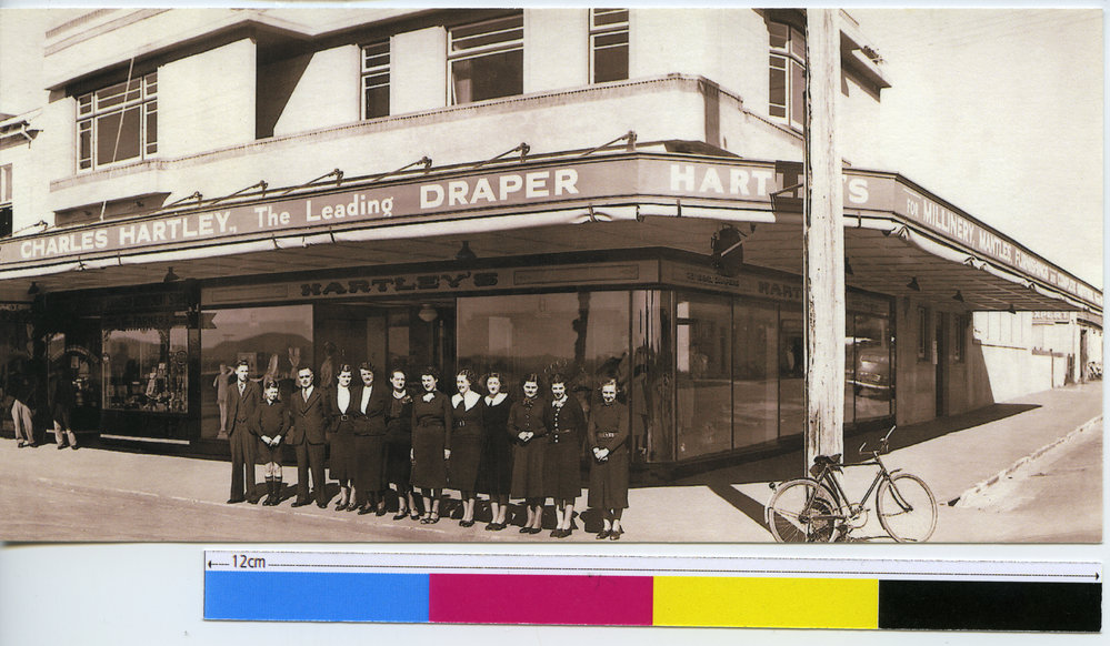 Staff standing outside of Charles Hartley, The Leading Draper, on the corner of The Strand and Hamilton Street, c. 1936.