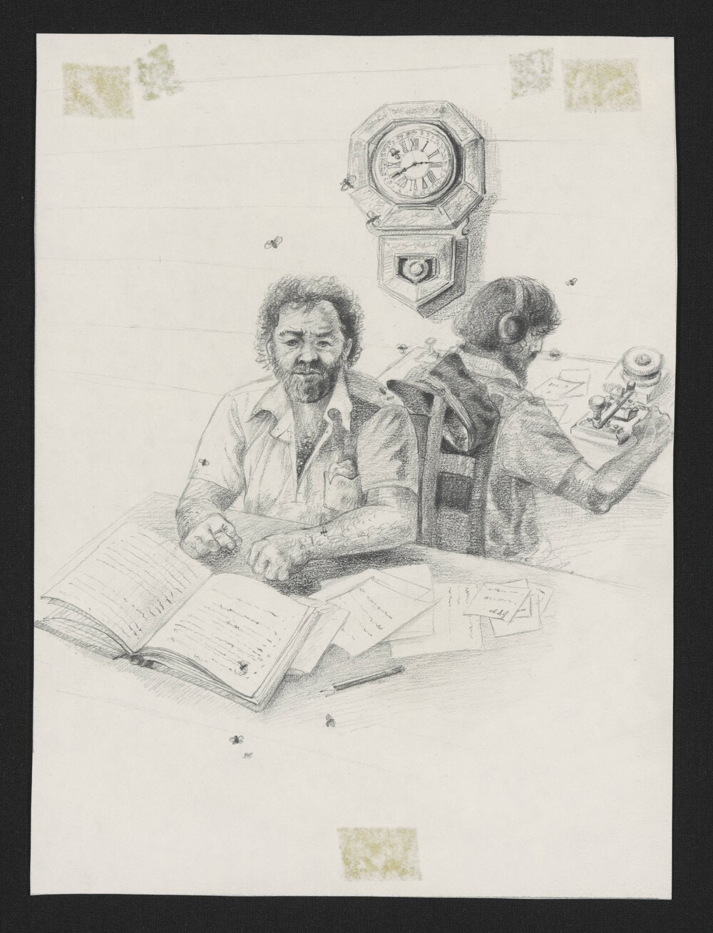 Date1981Reference NumberAms 508/2/7/6DescriptionIllustration for 'The Silent One', 1981, page 69. Two men working at desks with books, equipment, clock on the wall.