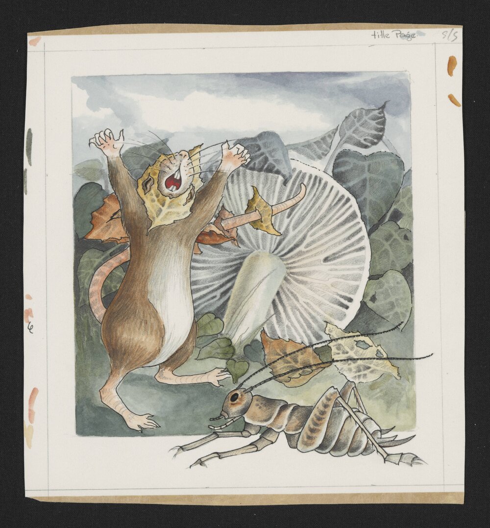 Jordan, Sherryl, 1949-2023, Stretching mouse with cricket (c. 1985). Pae Korokī, accessed 04/04/2026, https://paekoroki.tauranga.govt.nz/nodes/view/113072