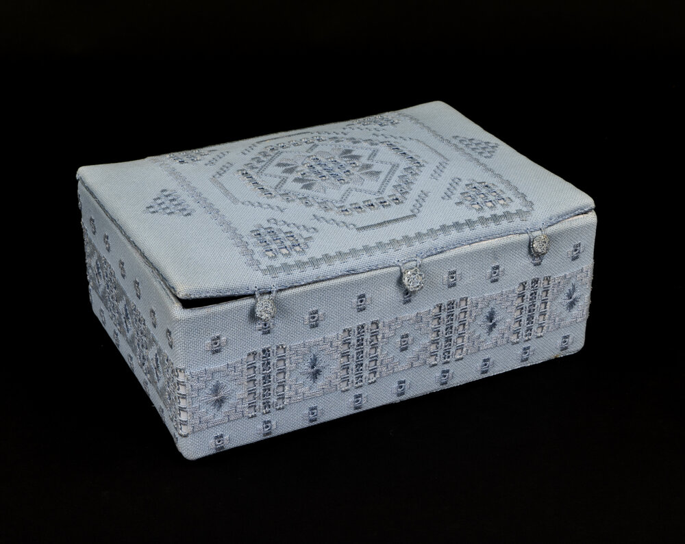 Datec. 1900s to c. 2008Reference NumberAms 406/1DescriptionPale blue embroidered, threadwork workbox.CreatorUnknownLevelItemFormatVariousExtent1 work boxPhysical DescriptionPale blue embroidered, textile work boxLanguageEnglish