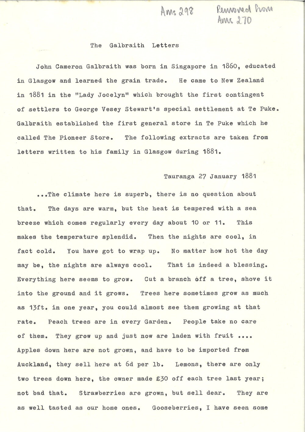 Galbraith, John Cameron, 1860-1907, Typescript of The Galbraith letters, 1881 (1881). Pae Korokī, accessed 08/04/2026, https://paekoroki.tauranga.govt.nz/nodes/view/113082