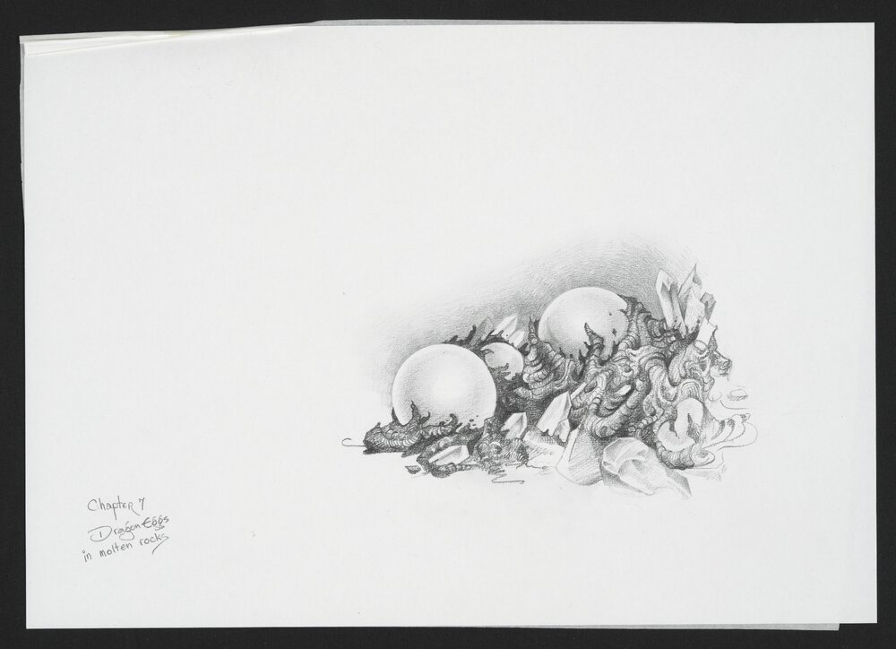 Jordan, Sherryl, 1949-2023, Chapter 7 illustration: Dragon eggs in molten rock (c. 2013). Pae Korokī, accessed 04/04/2026, https://paekoroki.tauranga.govt.nz/nodes/view/113096