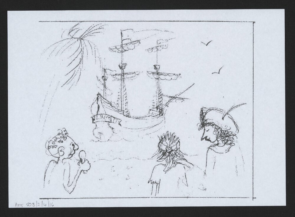 Jordan, Sherryl, 1949-2023, Photocopy of a sketch of ship and people (c. 2010). Pae Korokī, accessed 04/04/2026, https://paekoroki.tauranga.govt.nz/nodes/view/113136