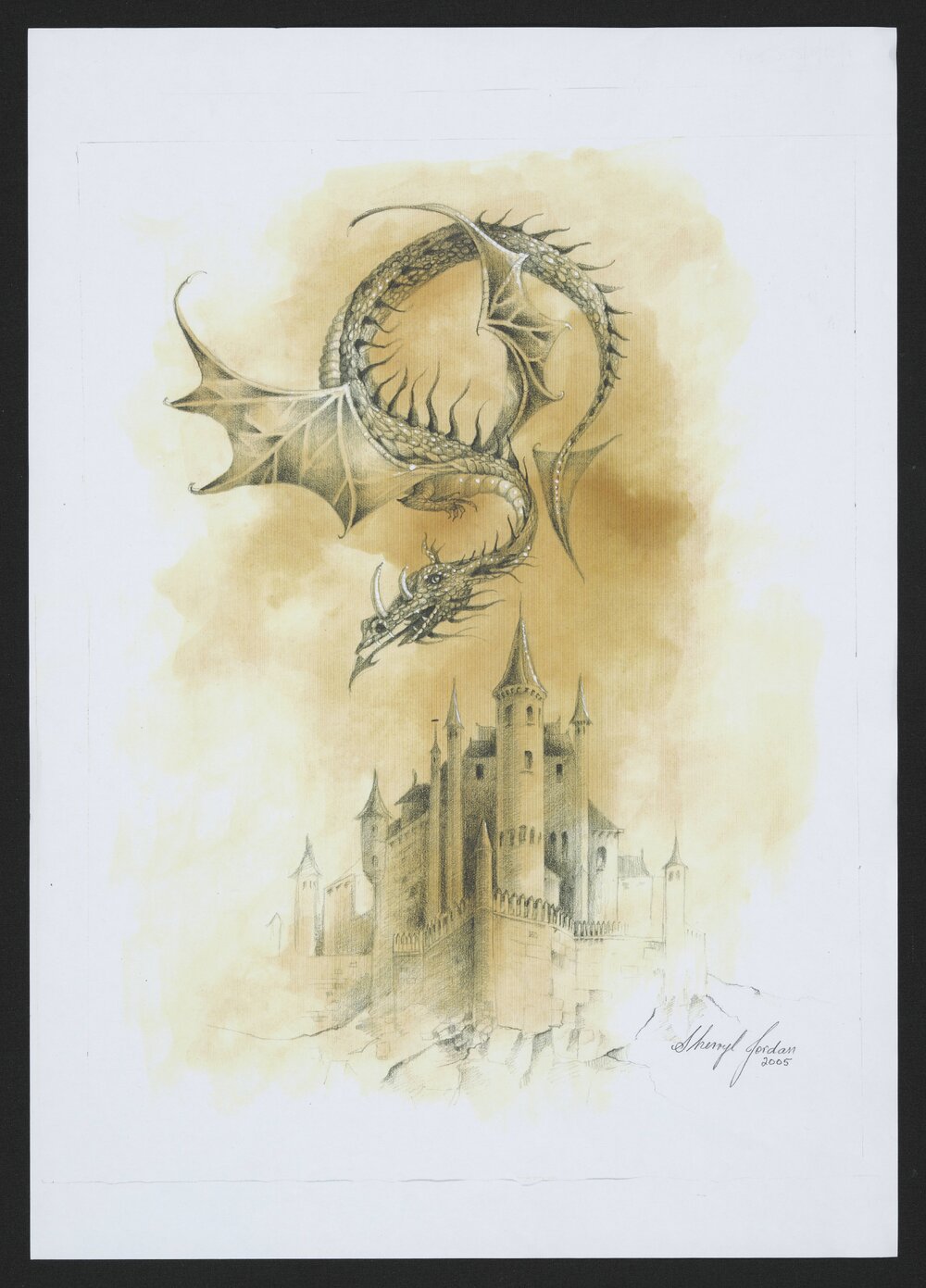 Jordan, Sherryl, 1949-2023, Photocopy of dragon flying above a castle, 2005 (2005). Pae Korokī, accessed 04/04/2026, https://paekoroki.tauranga.govt.nz/nodes/view/113158
