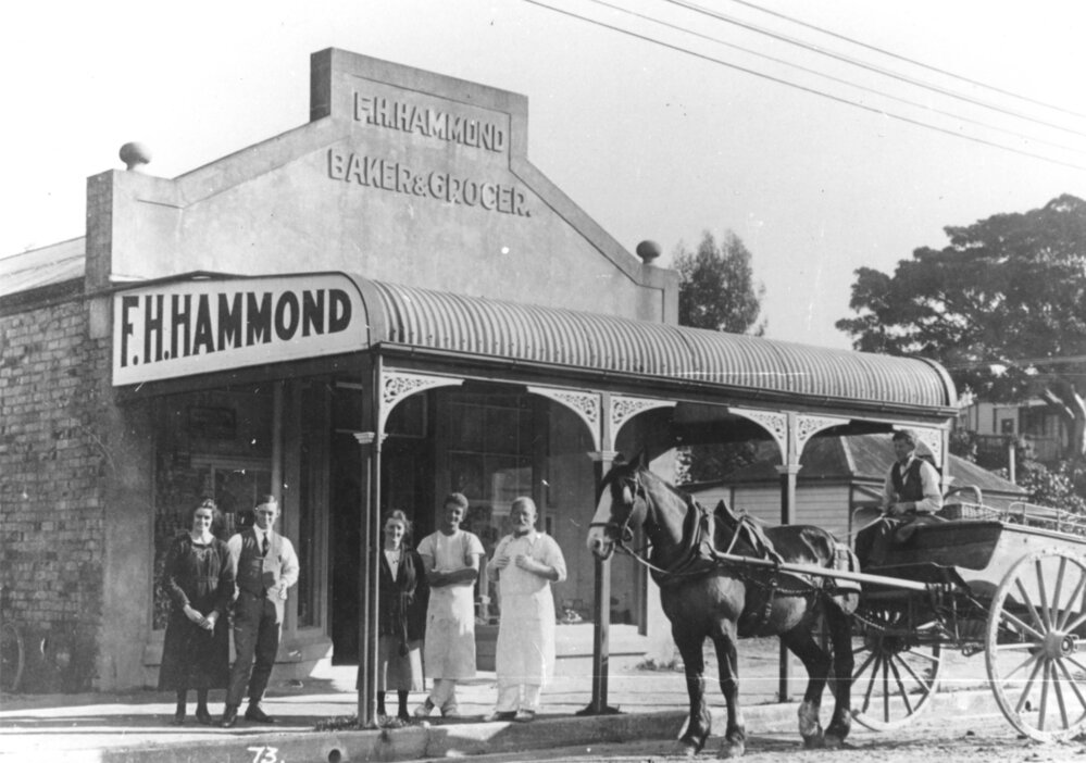 F.H. Hammond's bakery and grocer's shop on the south west corner of Willow Street and Hamilton Street, Tauranga, c. 1915.