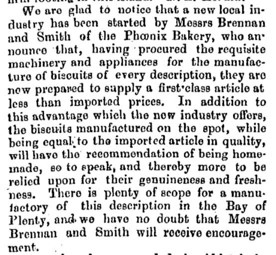 - Advertisement for Phoenix Bakery "Brennan and Smith have procured the requisite machinery and appliances for the manufacture of biscuits etc." Brennan and Smith, General Storekeepers, The Strand. Bay of Plenty Times, 16 June 1877.