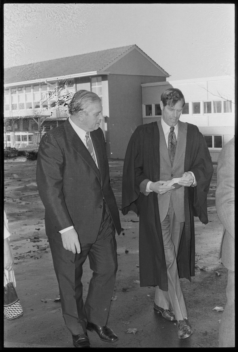 Prime Minister Norman Kirk with (principal Mr N. D. Morris?) during a visit to Tauranga Boys' College.