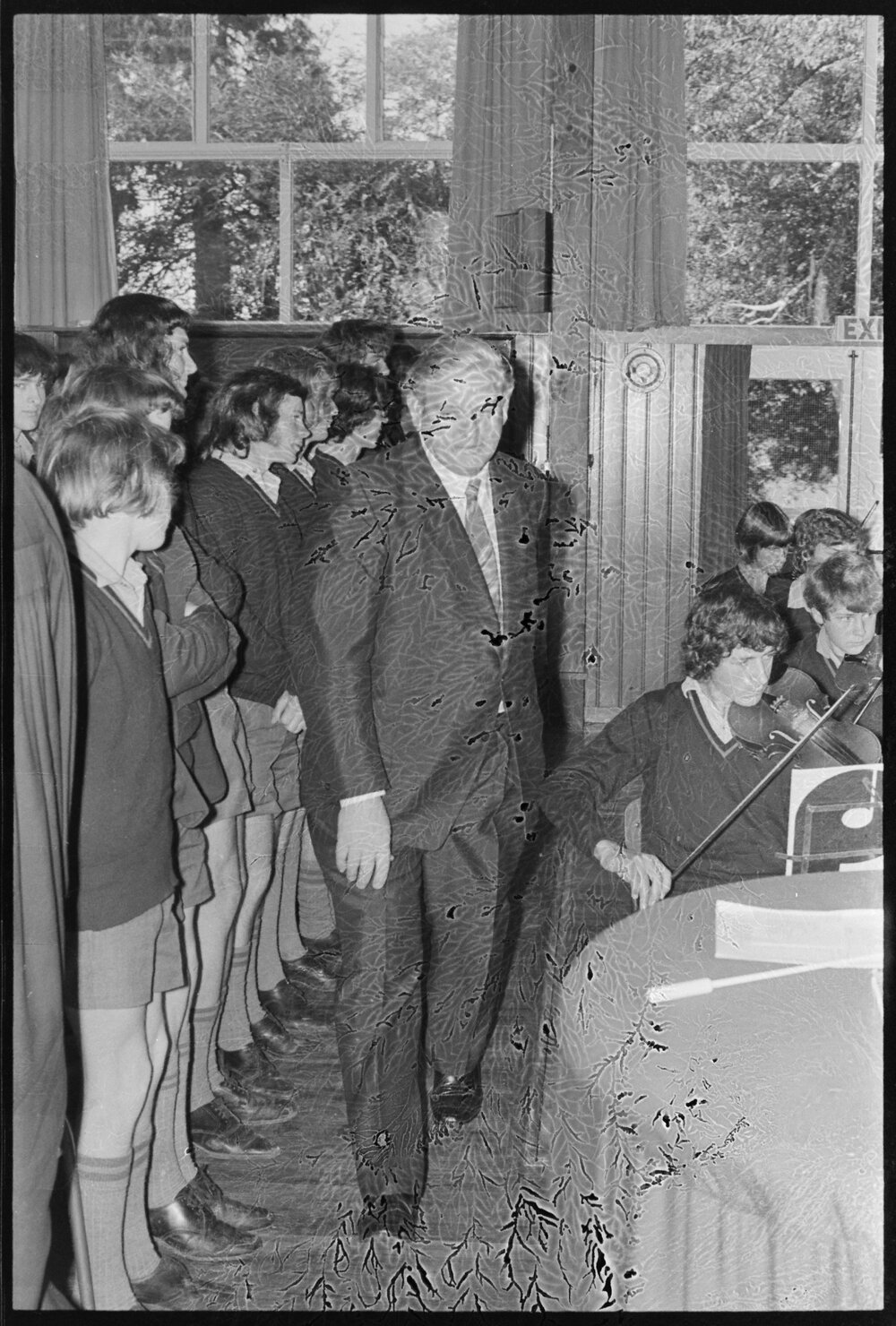 Prime Minister Norman Kirk entering an assembly during a visit to Tauranga Boys' College.