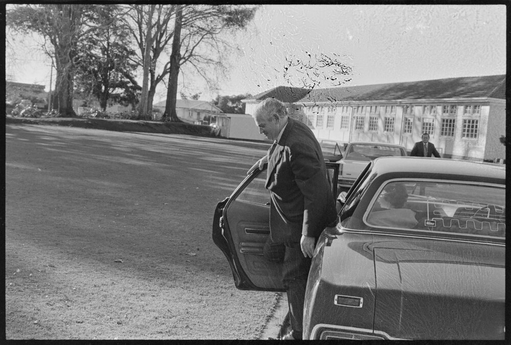 Prime Minister Norman Kirk arriving for a visit at Tauranga Boys' College. (27 June 1973). Pae Korokī, accessed 07/04/2026, https://paekoroki.tauranga.govt.nz/nodes/view/113265