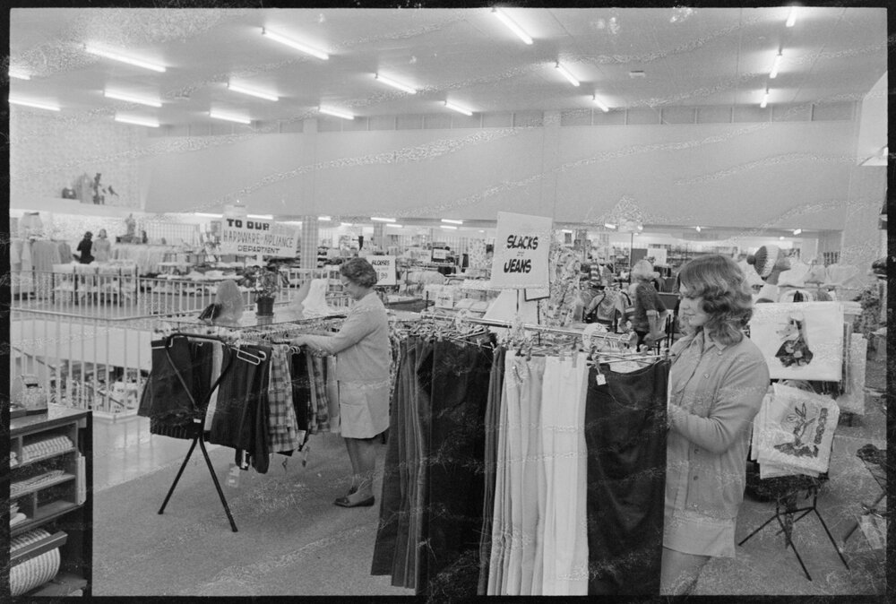 Retailing. Feminine apparel is a trendy and extended section of the new Farmers complex.