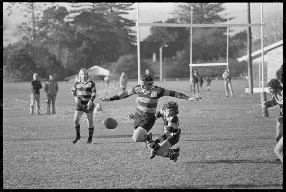 Rugby. Gavin McLauchlan (Cadets) is checked by Greerton centre Ash Brown. (28 June 1973). Pae Korokī, accessed 07/04/2026, https://paekoroki.tauranga.govt.nz/nodes/view/113306
