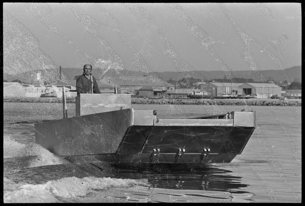 Mr A. Hyde testing a new jet barge on Tauranga Harbour. (4 July 1973). Pae Korokī, accessed 07/04/2026, https://paekoroki.tauranga.govt.nz/nodes/view/113356