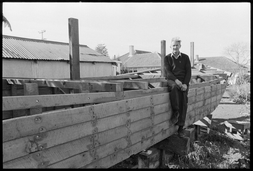 Captain Len Anderson building a half-size replica of the Tauranga scow Alma in his backyard.