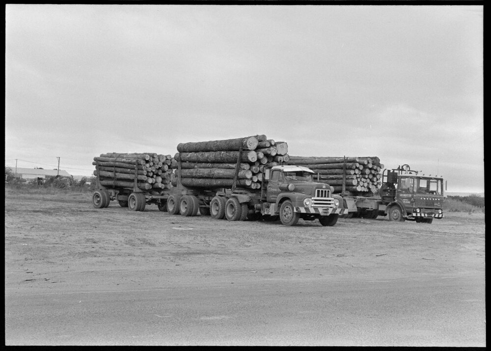 Date21 July 1973Reference Numberphoto gcc-28879DescriptionLogging trucks on the beach [at Mount Maunganui?].FormatNegativePhysical Description35mm black-and-white negativePhotographer/CreatorBay of Plenty Times
