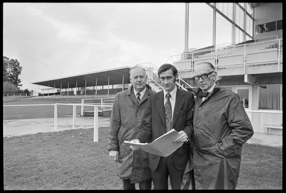 Horse racing. Bay of Plenty Racing Club officers look at sketch plans for a new public grandstand. (24 July 1973). Pae Korokī, accessed 06/04/2026, https://paekoroki.tauranga.govt.nz/nodes/view/113512