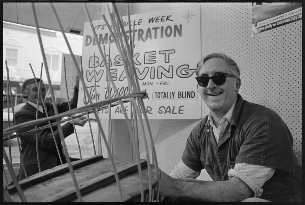 Blind basket weaver Mr Jim Williams demonstrates his skills in the window of Goddards Bookshop. (25 July 1973). Pae Korokī, accessed 06/04/2026, https://paekoroki.tauranga.govt.nz/nodes/view/113517