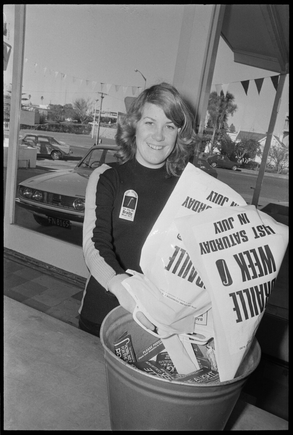 Braille Week collection day. Janine Polley tips her collection into a bin. (28 July 1973). Pae Korokī, accessed 06/04/2026, https://paekoroki.tauranga.govt.nz/nodes/view/113537