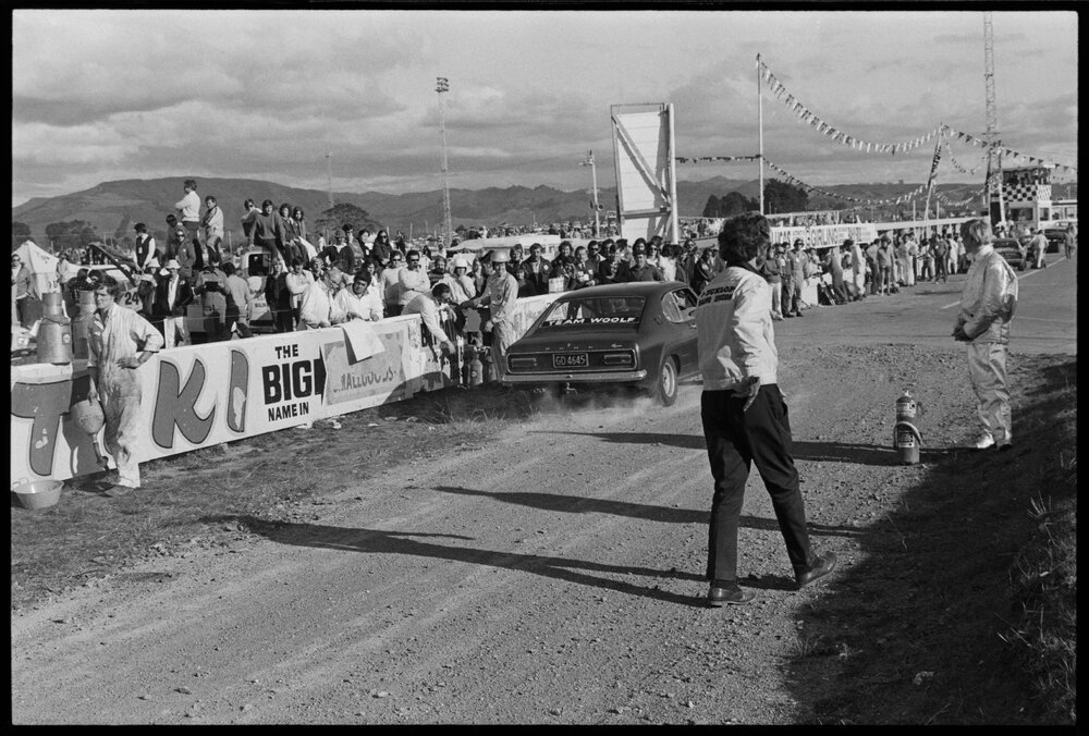 Motor racing. Team Woolf's Capri GT after a refueling stop in the Glenvale 200 production car race at Bay Park on Sunday. (30 July 1973). Pae Korokī, accessed 06/04/2026, https://paekoroki.tauranga.govt.nz/nodes/view/113562