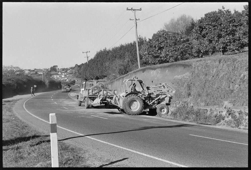Ministry of Works cutting back a bank on a corner of State Highway 2.