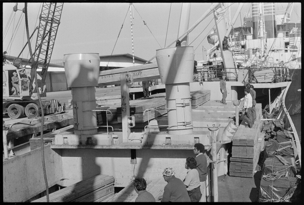 Ships. Capitaine Kermadec, newly acquired by the Sofrana Line, loading general cargo at Mount Maunganui wharf.