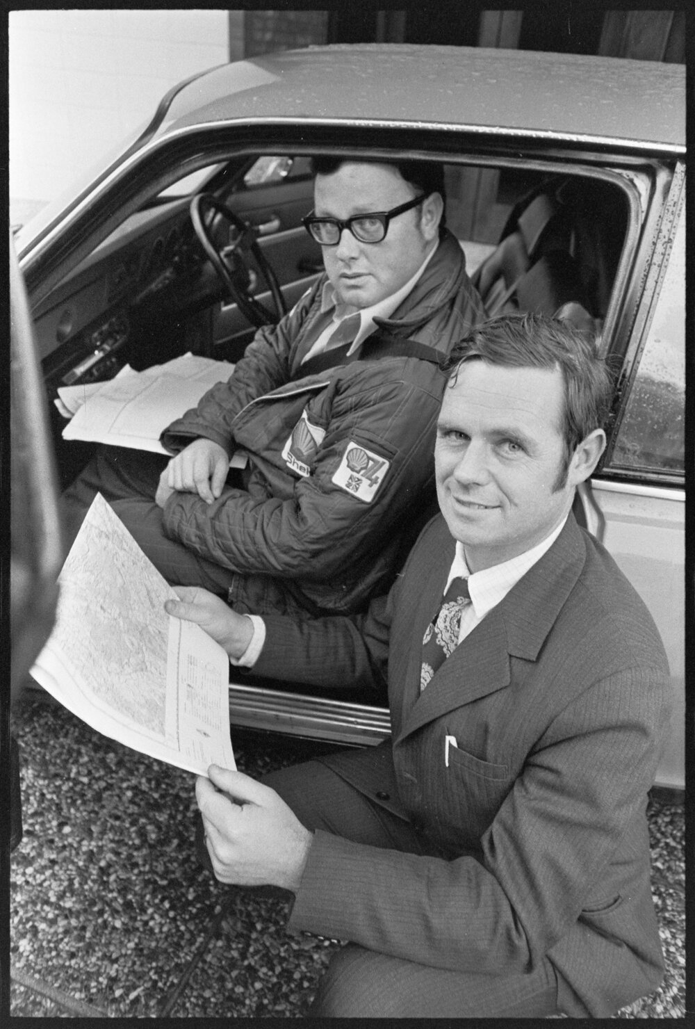 Motor racing. Warwick Sykes and Errol Inwood in Tauranga on a course proving trip for the Shell 74 rally.