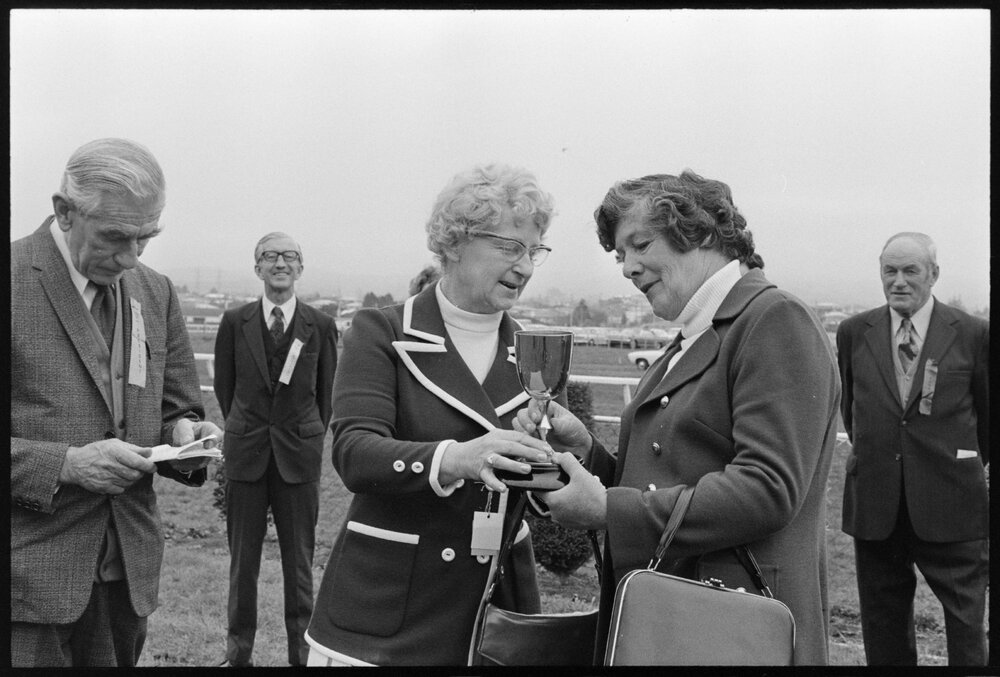 Horse racing. The Whakatāne Cup being presented to the wife of the owner-trainer of winning horse Sakata. (13 August 1973). Pae Korokī, accessed 06/04/2026, https://paekoroki.tauranga.govt.nz/nodes/view/113718