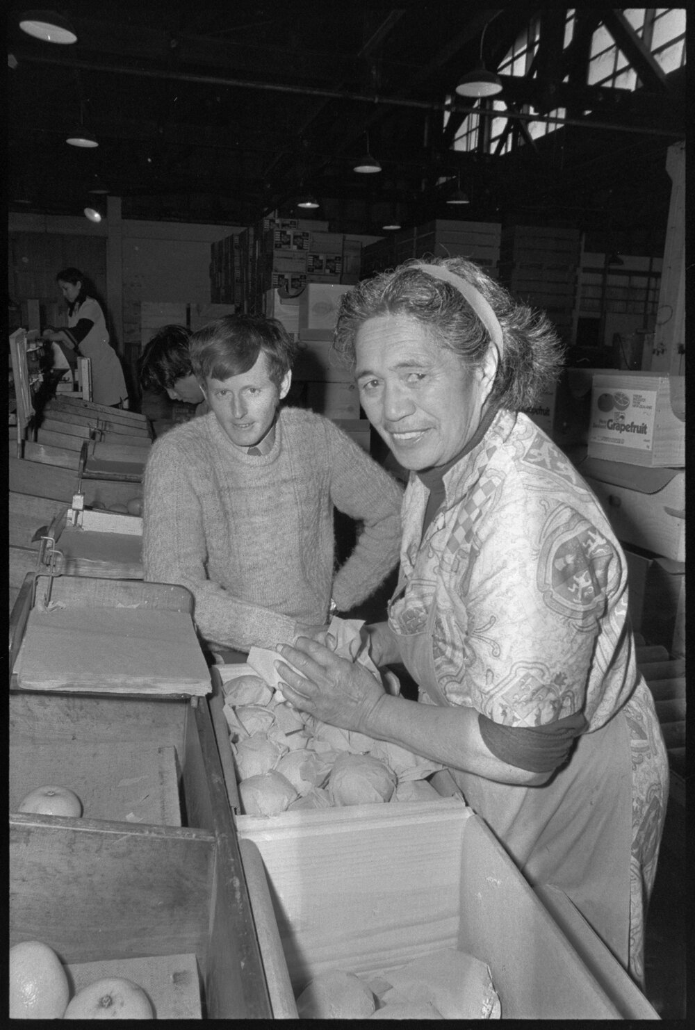 Mr R. E. Harding watching Mrs L. Tawa pack grapefruit at the Citrus Marketing Authority plant. (17 August 1973). Pae Korokī, accessed 06/04/2026, https://paekoroki.tauranga.govt.nz/nodes/view/113739
