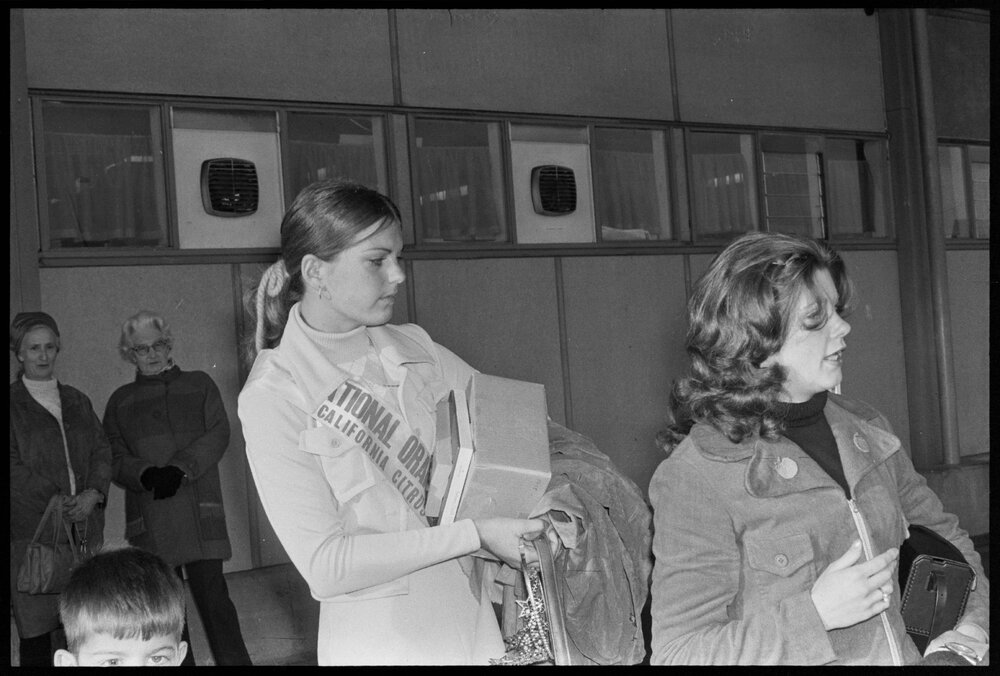 Caroline Fogg, the 1973 California Citrus Queen, being greeted at Auckland International Airport by reigning Bay of Plenty Queen Rosemary Caird. (20 August 1973). Pae Korokī, accessed 05/04/2026, https://paekoroki.tauranga.govt.nz/nodes/view/113753