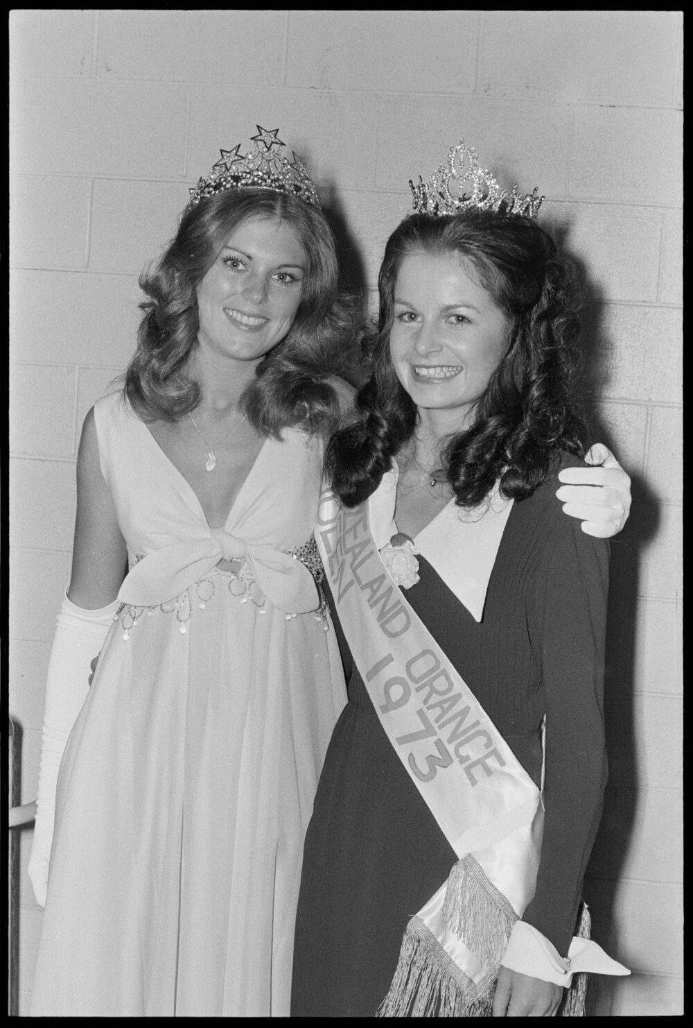 The new Bay of Plenty Orange Festival Queen Carolyn Swindlehurst, supported by the visiting California Citrus Queen. (27 August 1973). Pae Korokī, accessed 06/04/2026, https://paekoroki.tauranga.govt.nz/nodes/view/113795