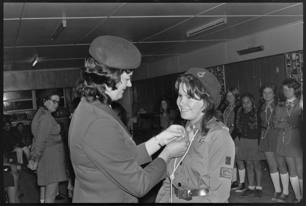 Date29 August 1973Reference Numberphoto gcc-29417DescriptionUnidentified Girl Guide receiving an award from an unidentified leader. Not published.FormatNegativePhysical Description35mm black-and-white negativePhotographer/CreatorBay of Plenty Times