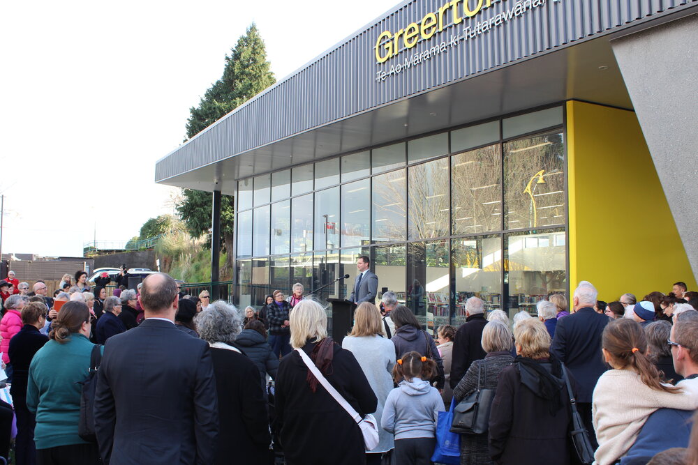 Crowds during the opening of Greerton Library, 2016 (15 July, 2016). Pae Korokī, accessed 24/03/2026, https://paekoroki.tauranga.govt.nz/nodes/view/114088