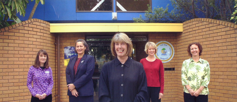 Mount Maunganui Library and staff, 8 April 2002. From left to right: Michelle Anderson, Tina Milroy, Elizabeth McMaster (Team Leader), Cheryl Goodwin, Jane Johnston. Te Ao Mārama - Tauranga City Libraries Photo 03-147